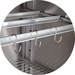 Имеется продуманная конвекция.В нашем случае, режим конвекции работает правильно, представьте: воздух уходит в воздуховоды по бокам термокамеры, ударяется о дно камеры и спиралью поднимается вверх. Видите?Таким образом, в каждой точке термокамеры будет одинаковый по температуре воздух и ваш продукт будет вкусным и не потеряет в весе.